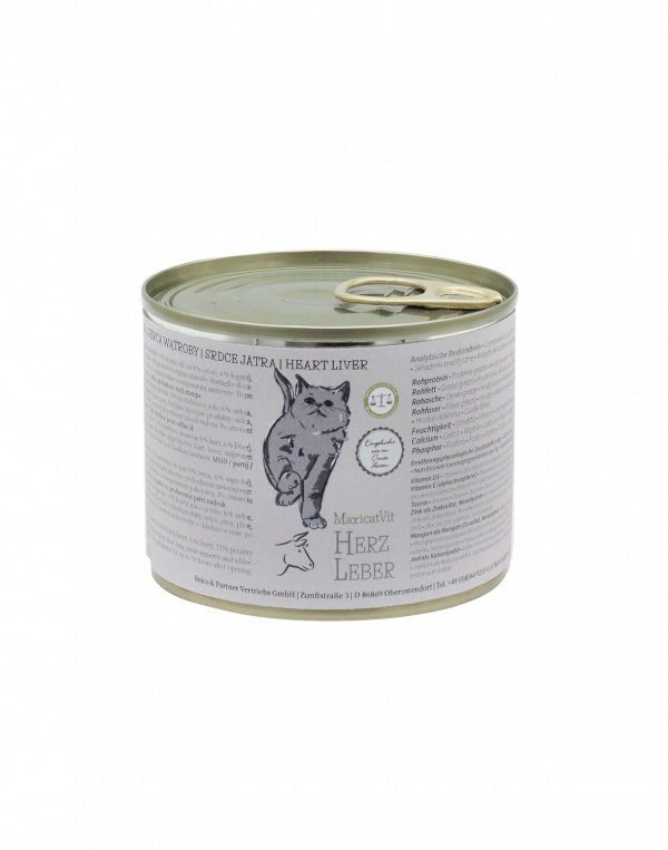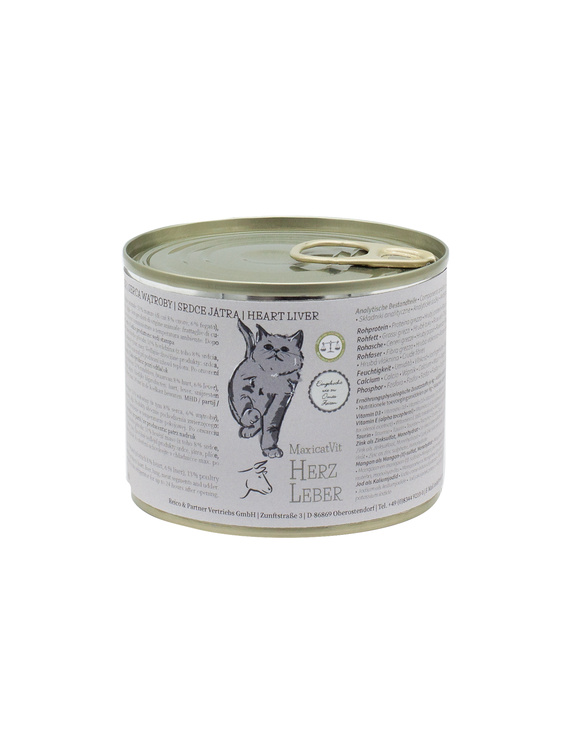 MaxicatVit Herz Leber ist ein Alleinfuttermittel mit ausschließlich hochwertigen Zutaten, das in Deutschland hergestellt und schonend kalt abgefüllt wird. Es enthält keine Aroma- und Konservierungsstoffe und keinen Zuckerzusatz. Probieren Sie auch unsere anderen Sorten für mehr Abwechslung. Fütterungsempfehlung: Eine Dose (200g) deckt den Tagesbedarf einer Katze bis 3 kg Gewicht. Bitte füttern Sie immer zimmerwarm und passen die Futtermenge an Rasse, Alter und Aktivität an.