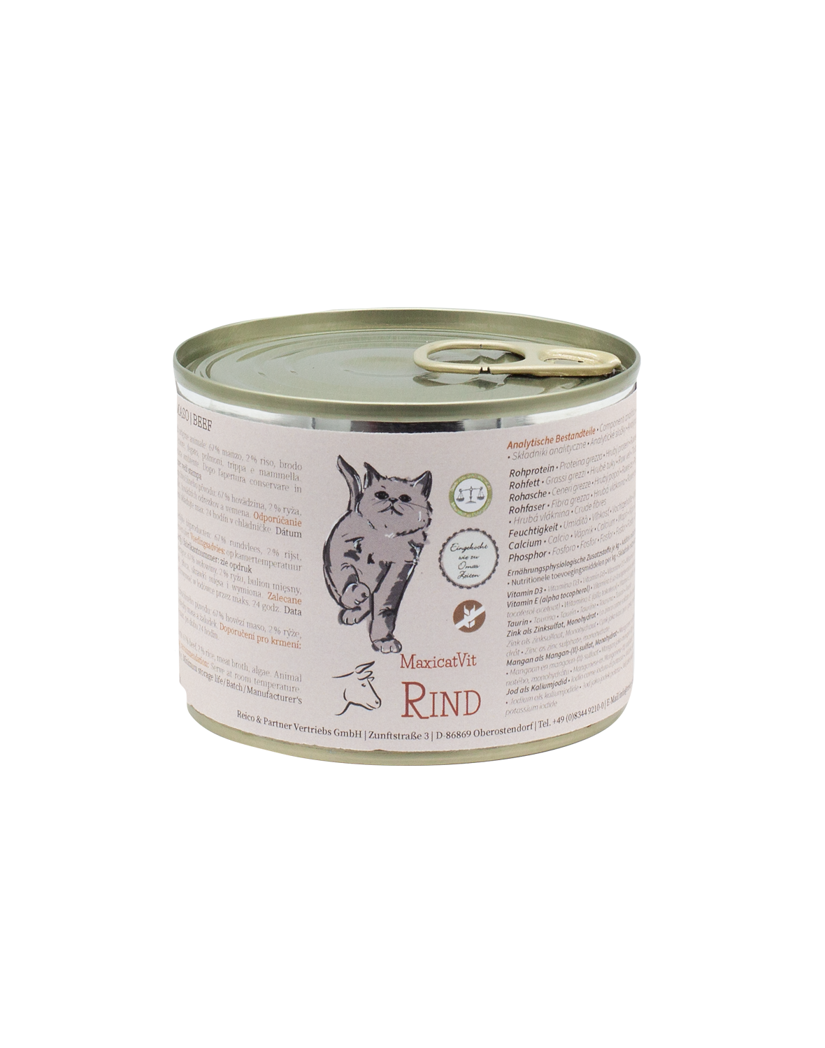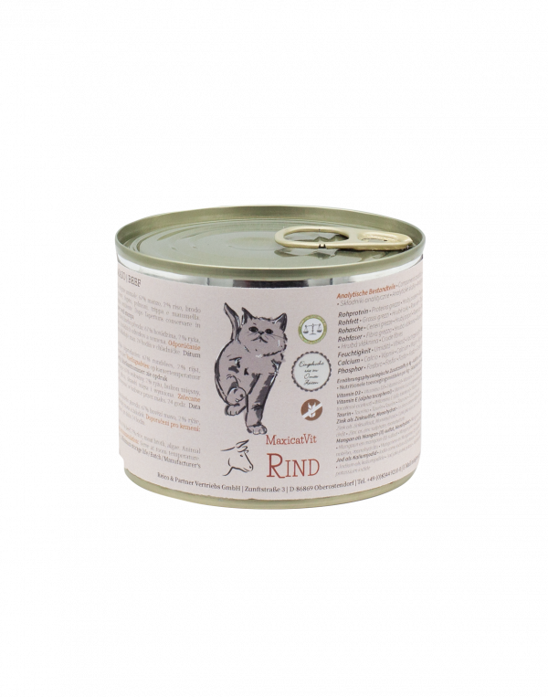 MaxicatVit Rind ist ein Alleinfuttermittel mit ausschließlich hochwertigen Zutaten, das in Deutschland hergestellt und schonend kalt abgefüllt wird. Es enthält keine Aroma- und Konservierungsstoffe und keinen Zuckerzusatz. Probieren Sie auch unsere anderen Sorten für mehr Abwechslung. Fütterungsempfehlung: Eine Dose (200g) deckt den Tagesbedarf einer Katze bis 3 kg Gewicht. Bitte füttern Sie immer zimmerwarm und passen die Futtermenge an Rasse, Alter und Aktivität an.