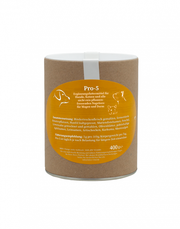 Pro-5 ist eine Mischung aus fermentierten Kräutern, probiotischen Kulturen, Ballaststoffen und Darmflora- Stabilisatoren, die zur Unterstützung einer normalen Magen- Darm-Funktion gefüttert wird. Pro-5 kann bei Verdauungsstörungen, Blähungen und weiteren Magen-Darm Problemen unterstützen, sowie nach Behandlungen mit Antibiotika, bei Stress, Unruhe oder hoher körperlicher Belastung eingesetzt werden.