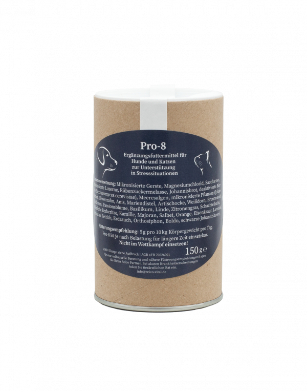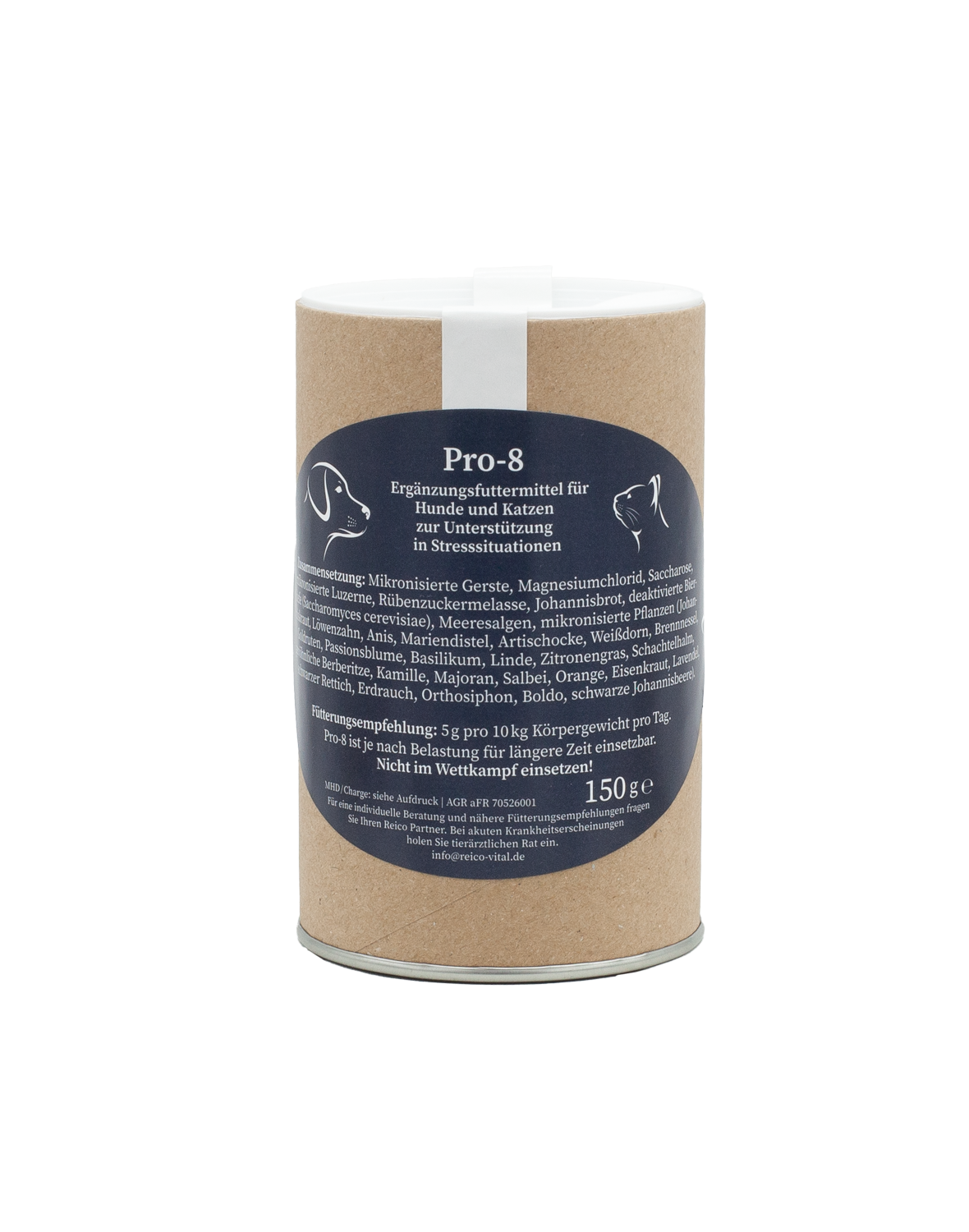 Pro-8 ist eine Mischung aus Kräutern, Hefen, Meeresalgen und Aromasubstanzen, die vor und nach Stresssituationen, sowie zur sanften Unterstützung bei Ruhelosigkeit und Panik eingesetzt werden kann.